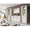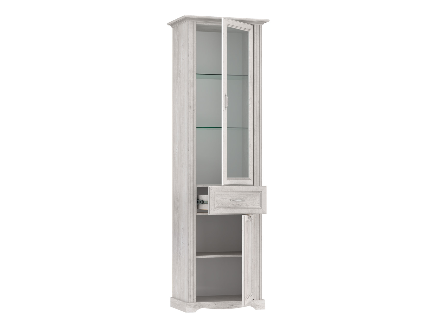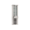 Изящная узкая модель не займет много места в комнате. Благодаря стеклянной дверце красивые предметы будут на виду, но защищены от пыли. Элегантный декор в виде рамок и лаконичные ручки украшают интерьер и придают обстановке особый шарм.